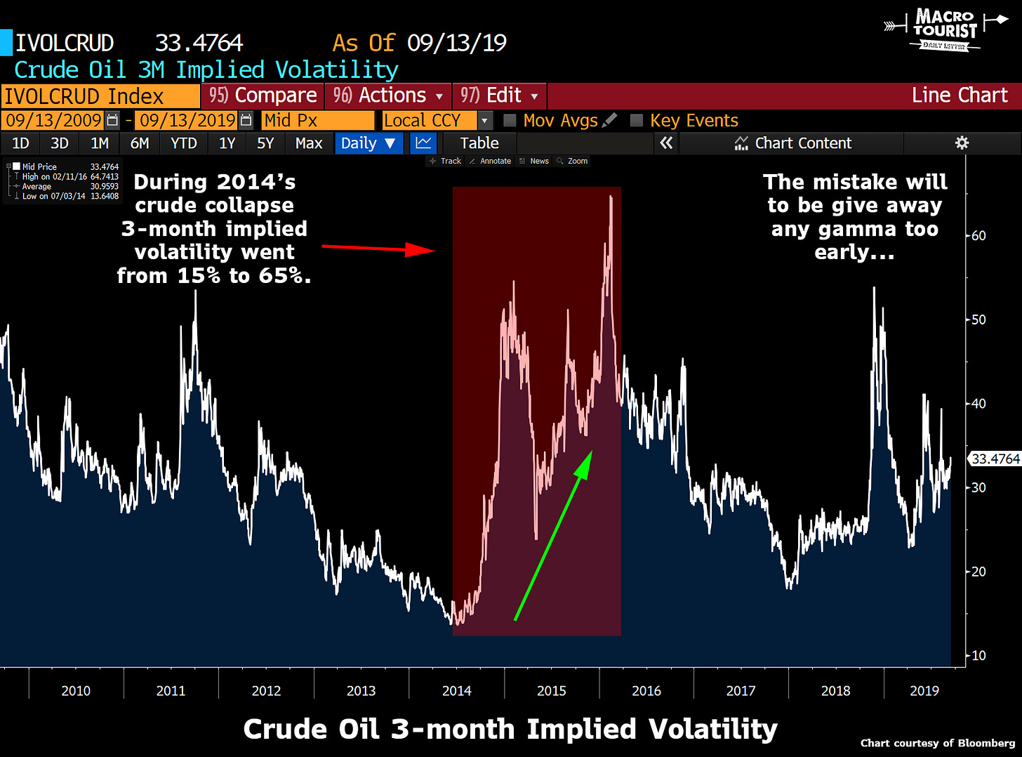 I am not sure about the direction of the next five buck move in oil, yet I am confident that implied volatility will not be collapsing anytime soon. And if it does, it’s probably an even better buy as geopolitical risks will once again be under appreciated.