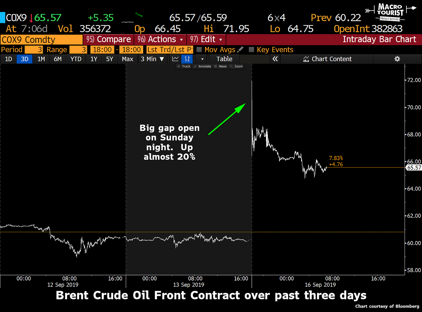 The development definitely caught the market flat-footed. Brent crude (which is more vulnerable to Saudi production shortfalls) gapped up almost $12 Sunday night.
