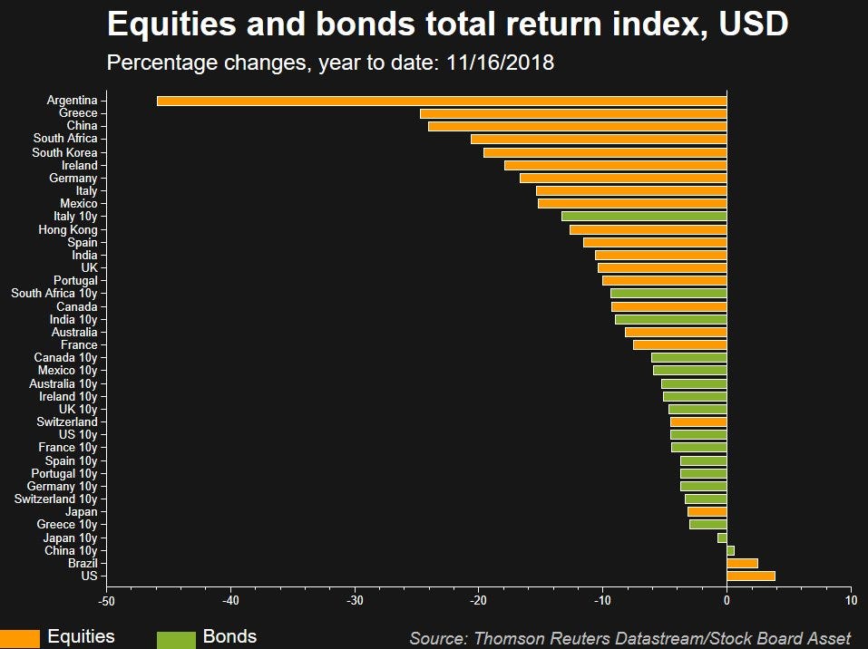 It’s a great table for it shows that both bonds and stocks around the world have suffered this year with almost no financial asset class posting positive returns. Brazilian and American stocks, along with Chinese 10-year bonds, were the only ones that could muster a return with a plus at the front. And even those returns were anemic.