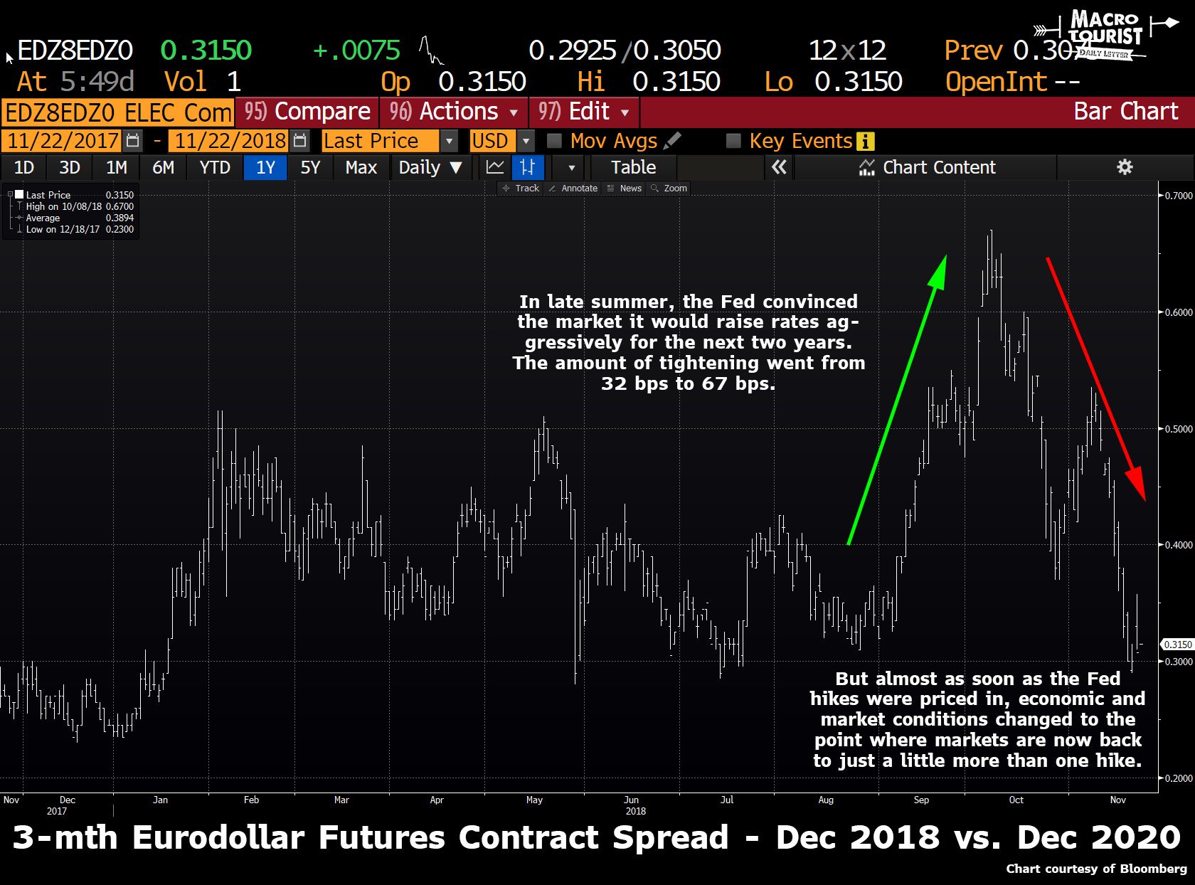 Let’s look at the 3-month Eurodollar futures contract spread between December 2018 and December 2020. Although Eurodollar interest rate futures do not track fed funds perfectly, they are close enough for our purpose. This spread represents the total amount of rate rises between December 2018 and two years later.