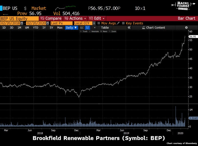 Let's start with my favourite "green" name - Brookfield Renewable Partners (symbol: BEP). No, my partiality is not because the CEO is from my prairie hometown of Winnipeg, but because Brookfield is a superbly well-run shop and ends up being an active manager of renewable assets that will do a much better job exploiting opportunities than I ever hope to.