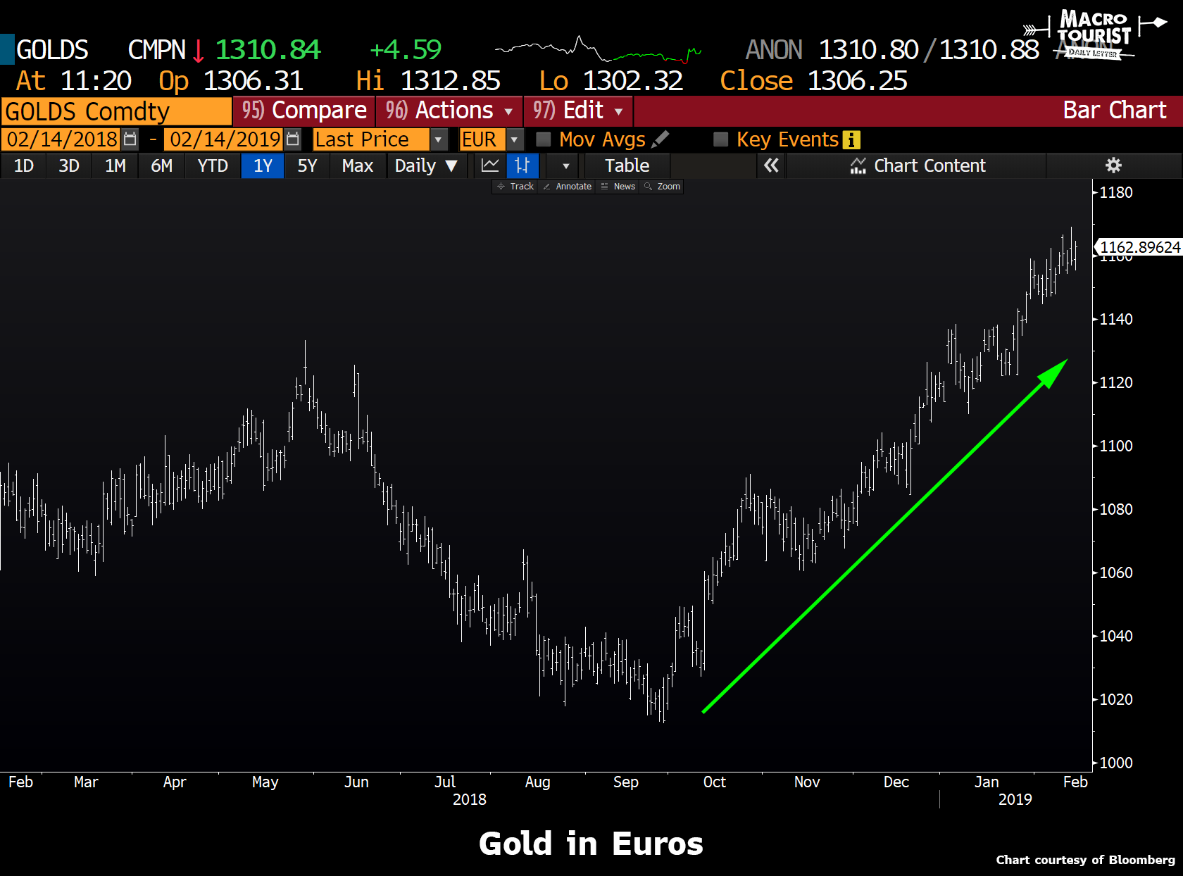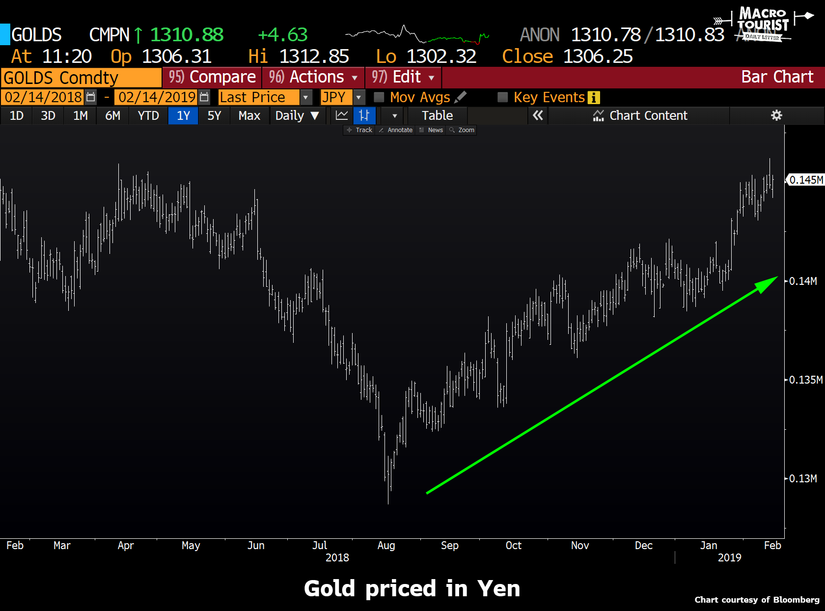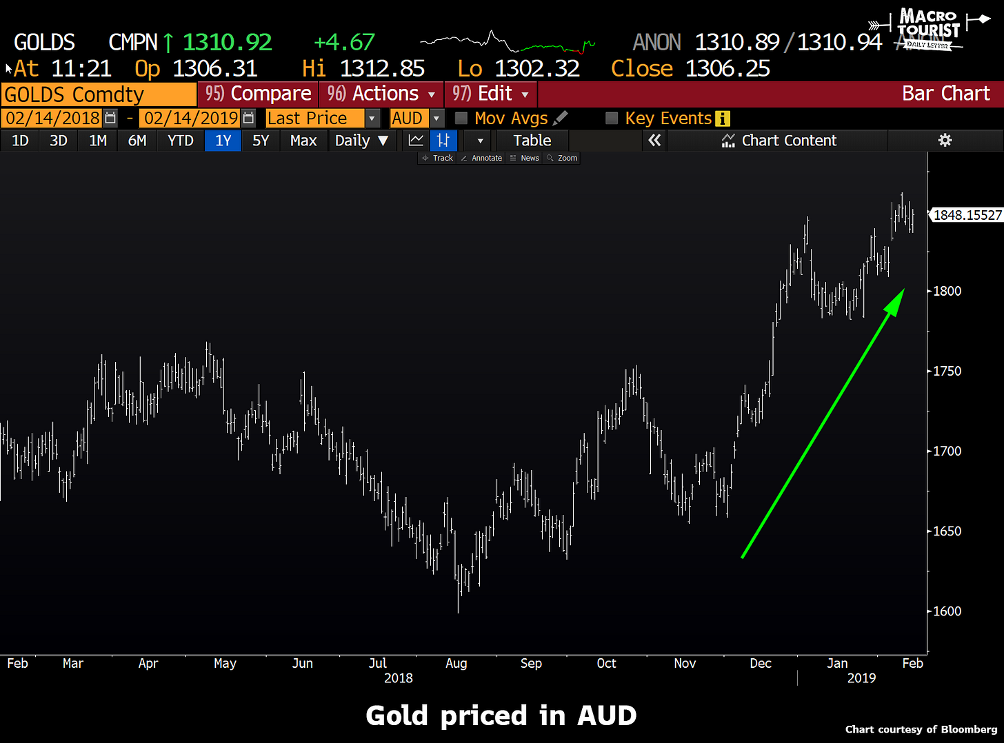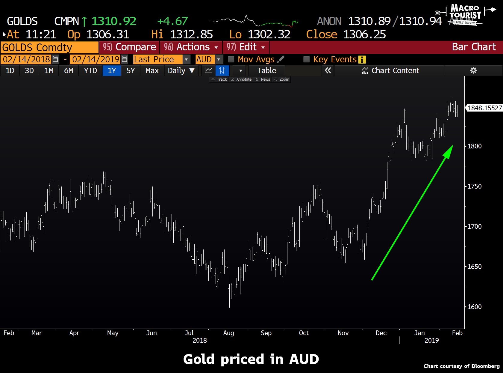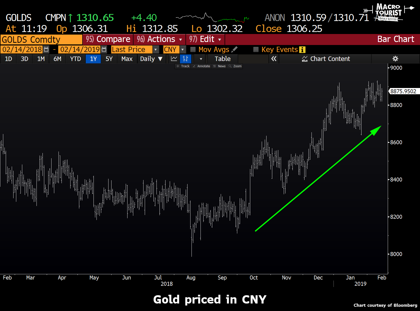 Whether it’s gold priced in CNY, EUR, JPY or AUD, it’s all the same chart - gold has had a strong rally in every currency.
