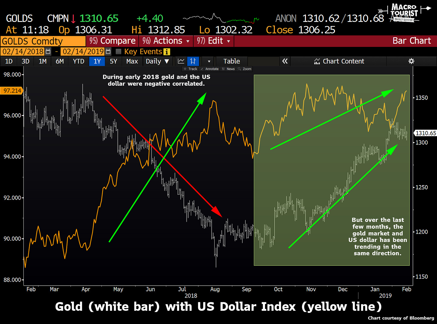 For the first three quarters of 2018 gold was indeed trading almost lockstep inverse to the US dollar. The US dollar was going up while gold was falling tick-for-tick.