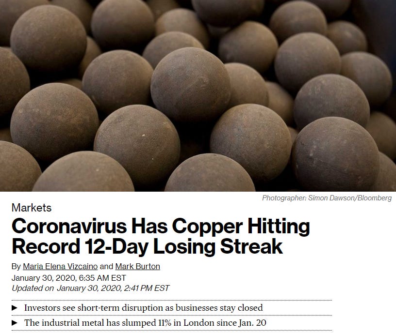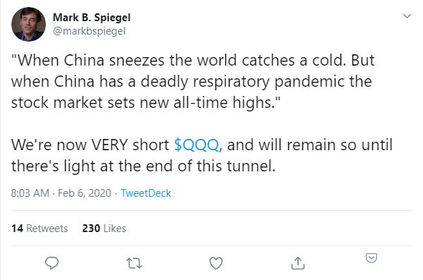 Yeah, it certainly feels like the market is completely ignoring the serious ramifications of shutting down the second biggest economy in the world. Could this be the moment when the Coyote is hanging mid-air right before plunging to his demise (at least until next week)? Sure. If the virus were to get out in the Western world's population and start multiplying at the speed at which it did in the initial Chinese outbreak, then markets would go NO BID.
