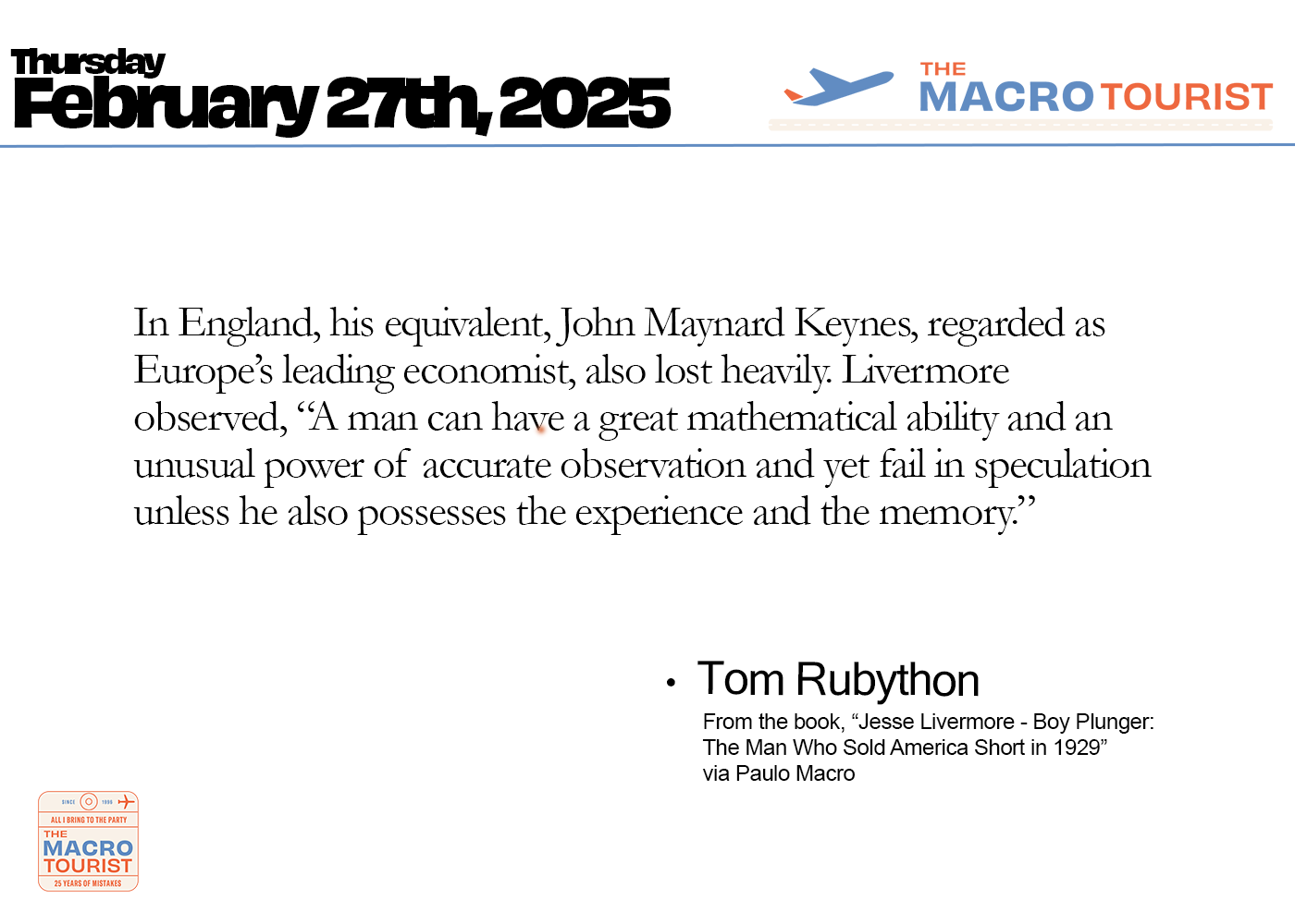 The MacroTourist Private Feed via EmailM'tourist Private Feed Recapfor Thursday, February 27th, 2025Kevin MuirFeb 28, 1985∙ Paid5ShareInteresting Charts: The US stock market has seen some decent selling over the past week, with the Nasdaq 100 now down 7.5% from the all-time high.This post is for paid subscribersSubscribeAlready a paid subscriber? Sign inPreviousNext