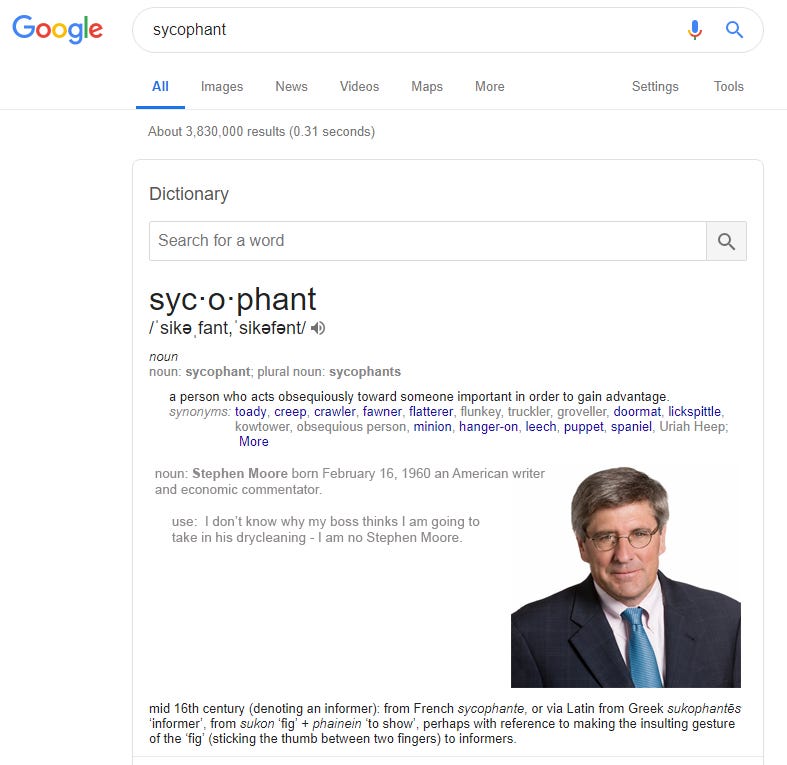 Geez… I am not sure about Moore’s claim, but when I googled “sycophant” I was surprised to find some contradictory evidence: