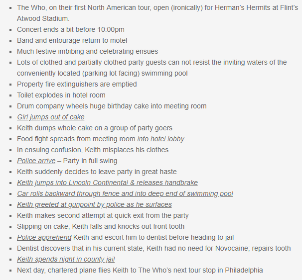 PS: For those too young to recognize all these rock legends, I recommend you spend some time learning how Keith Moon from the Who was given a global lifetime ban from Holiday Inns for driving a car into a swimming pool. Here is a quick recap of Keith’s night.