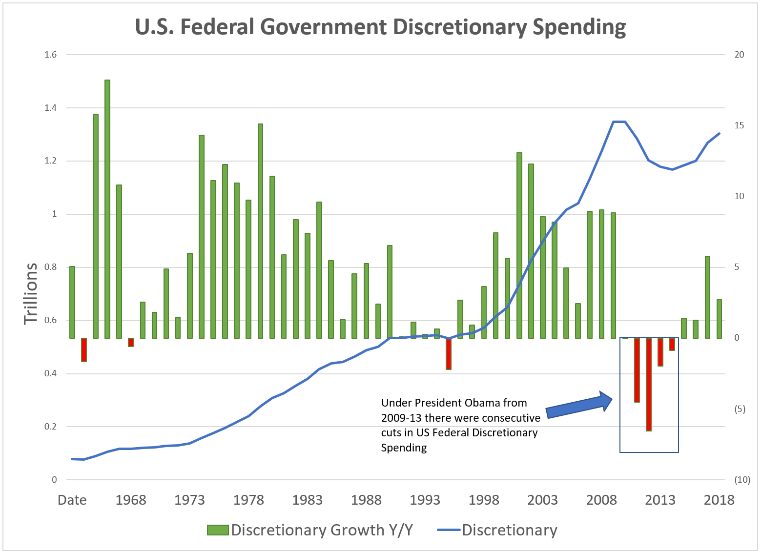 Obama took over as President on January 20th, 2009 just as the Great Financial Crisis was beginning to bite. Before that point, during the previous four decades, the United States had three years when the federal government discretionary spending had fallen on a year over year basis. The 1960s saw two of those discretionary budget cuts – 1964 and 1968 - and the third was 1995. Prior to 2009, year after year, the United States government had for the most part consistently increased the discretionary spending of the federal budget.