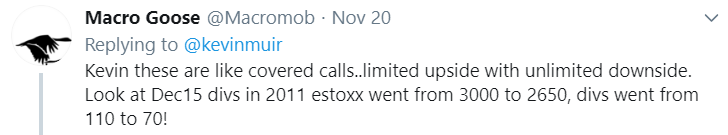 The reason I share this story, is just to remind you that even though divs seem very cheap today in a benign environment, if we have a crisis, these things will go from cheap to way cheaper. Also there are no natural buyers of divs, just hedge funds and traders who are speculating.