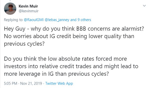 On the other side of the coin (you know, someone who might actually agree with me), a reader was kind enough to highlight GMO's Peter Chiappinelli's presentation from this Fall's Grant Interest Rate Observer Conference. Unfortunately I cannot share it with you as it is a paid-for-product, but man-oh-man, it makes me upset that I didn't attend that event. It's probably one of the best presentations highlighting the risks to credit markets that I have seen in ages. It's not emotional. It's not hyperbolic. It calmly sketches out the poor risk reward that is BBB's investing at these levels.