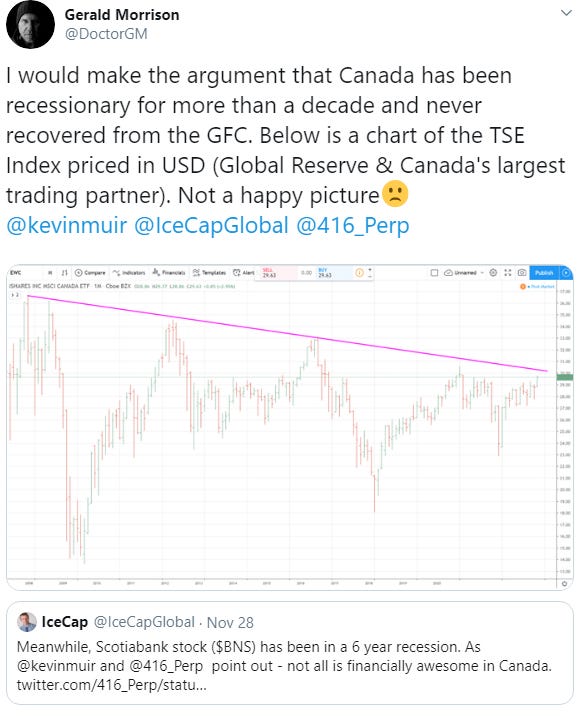 My article also had lots of comments on twitter. It seemed like the Canadians were more sympathetic to my argument, while the rest of the world was busy telling us how great everything is (and will continue to be) in Canada. However, one loyal reader rightfully pointed out that when measured by the return of our stock market in US dollars, Canada has been suffering for some time now.