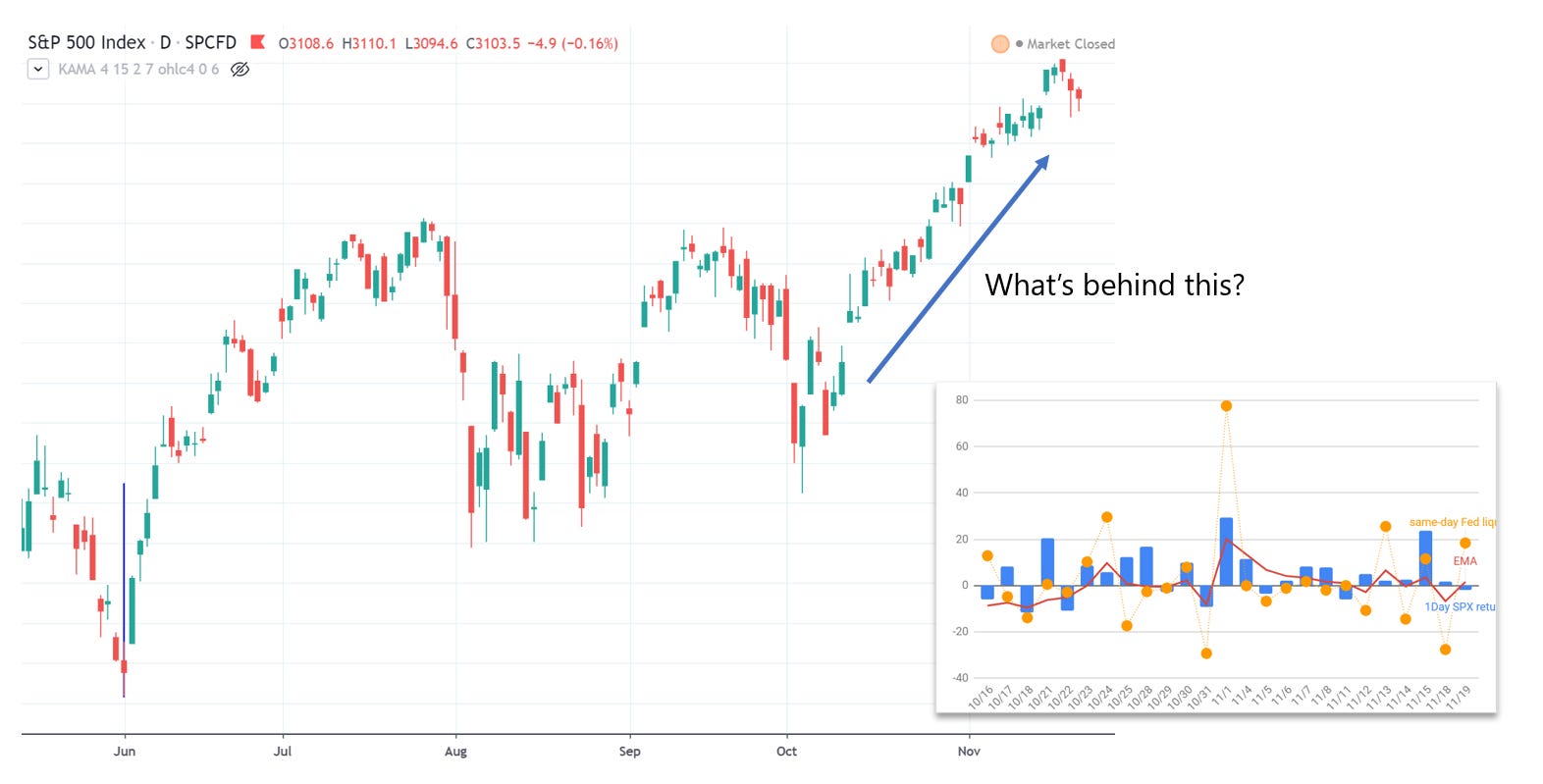 I am leaving you with one of my favourite charts. It's controversial. And all the financial theoreticians will tell you that there is no way the Fed's liquidity affects stock market returns on a day-to-day basis. Well, I don't believe them. And I don't think that my pal Barton_Options does either because he has made this chart of the S&P 500.