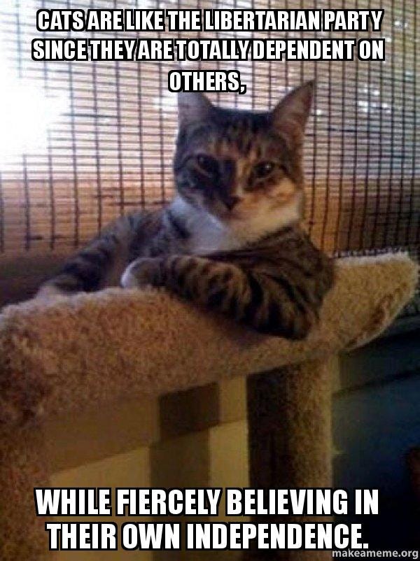 Now, Jim is a libertarian. A rather staunch one at that. Years of working in investment banking and seeing the government mess things up has made him believe the government can do nothing right. I disagree. But I like debating Jim. Again, he keeps me honest, but since this is my letter, I can control the tone, and I am going to first include my favourite libertarian meme before Jim's rant: