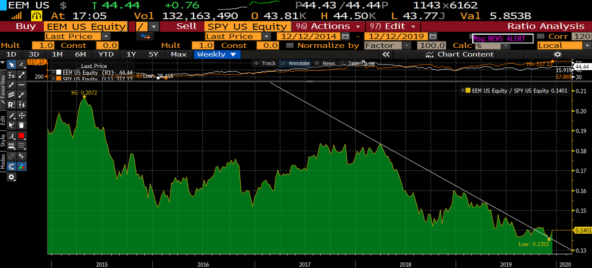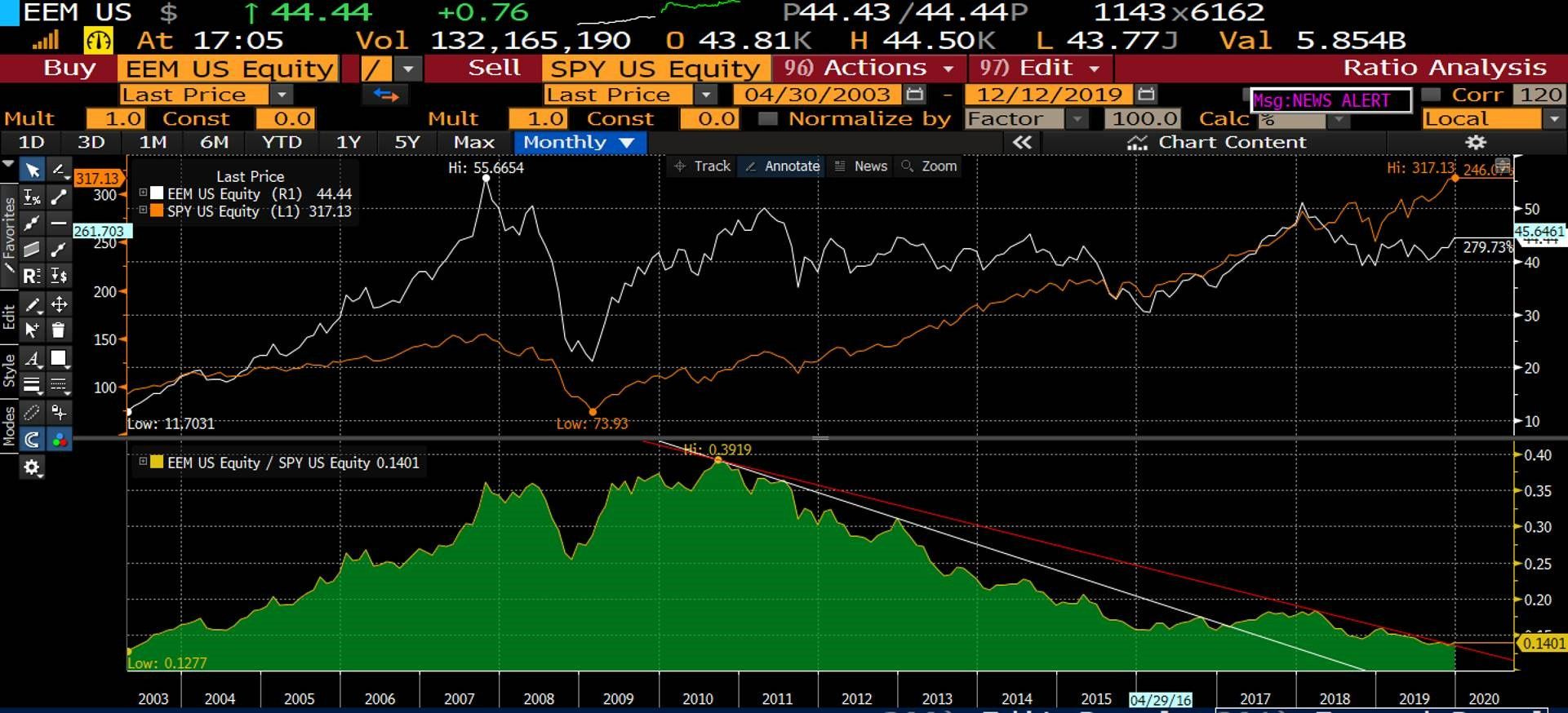 No doubt it is cheap! I love EEM and although my grandmother keeps trolling me on twitter about my bad call (she has recently gone 100% long SPY), I stick by my view EEM will outperform in 2020.