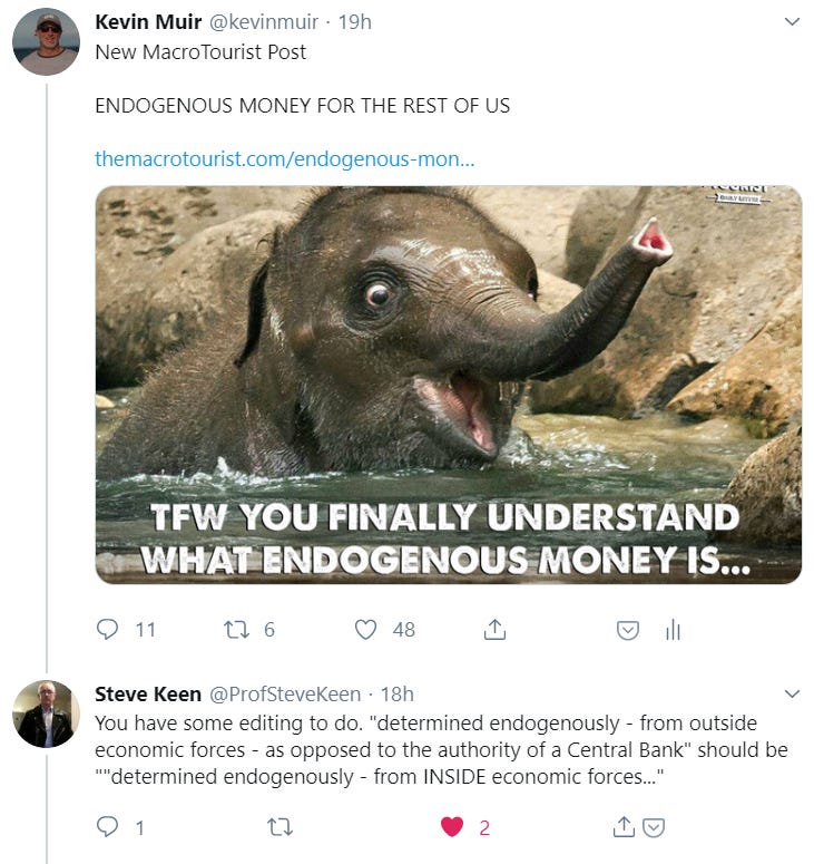 Kidding aside, this piece tackled a complicated topic. I tried to make it simpler, but the fact is that sophisticated economic professors debate this issue all the time. Although I firmly believe in endogenous money theory, it is by no means accepted in main-stream economics.