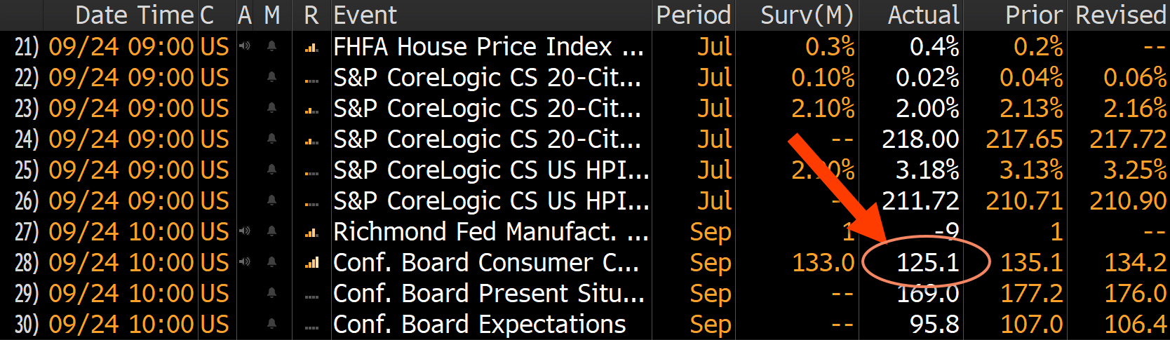 Initial jobless claims have been well behaved and show no signs of faltering. Consumer confidence had been resilient, but today’s release showed the first potential cracks.