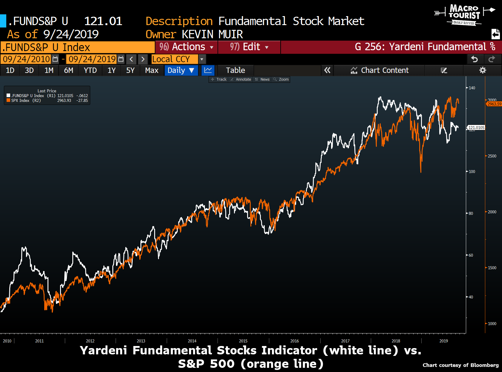 One of my favourite indicators is Ed Yardeni’s “Fundamental” Stock Indicator. I have written about it in The Best Unknown Indicator and Obi-Ed’s Magical Indicator so there is no need for me to rehash all the details. Needless to say, I have learned the hard way not to disregard this signal. When either series diverge, it seems like it’s only a matter of time before they converge again.